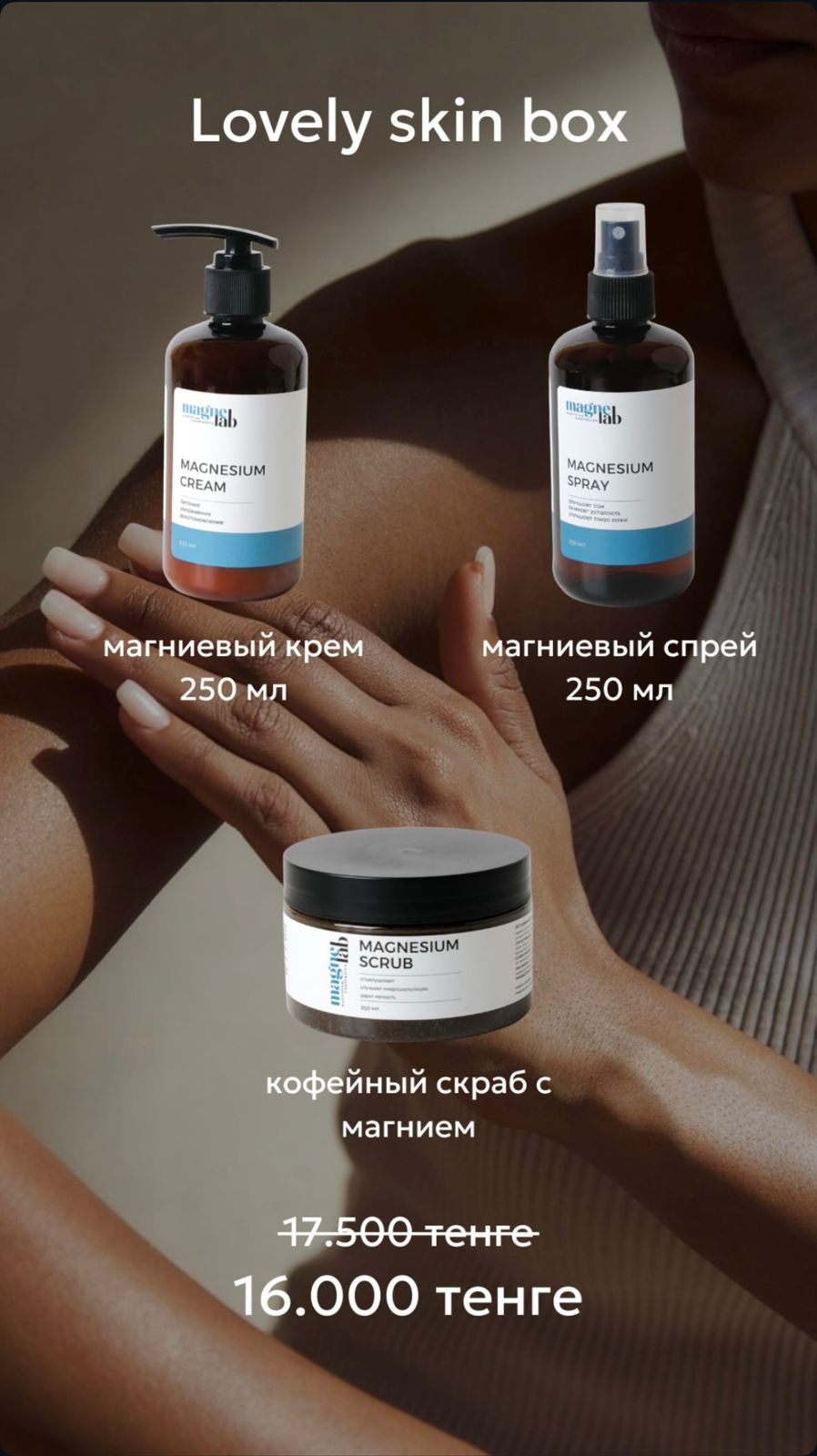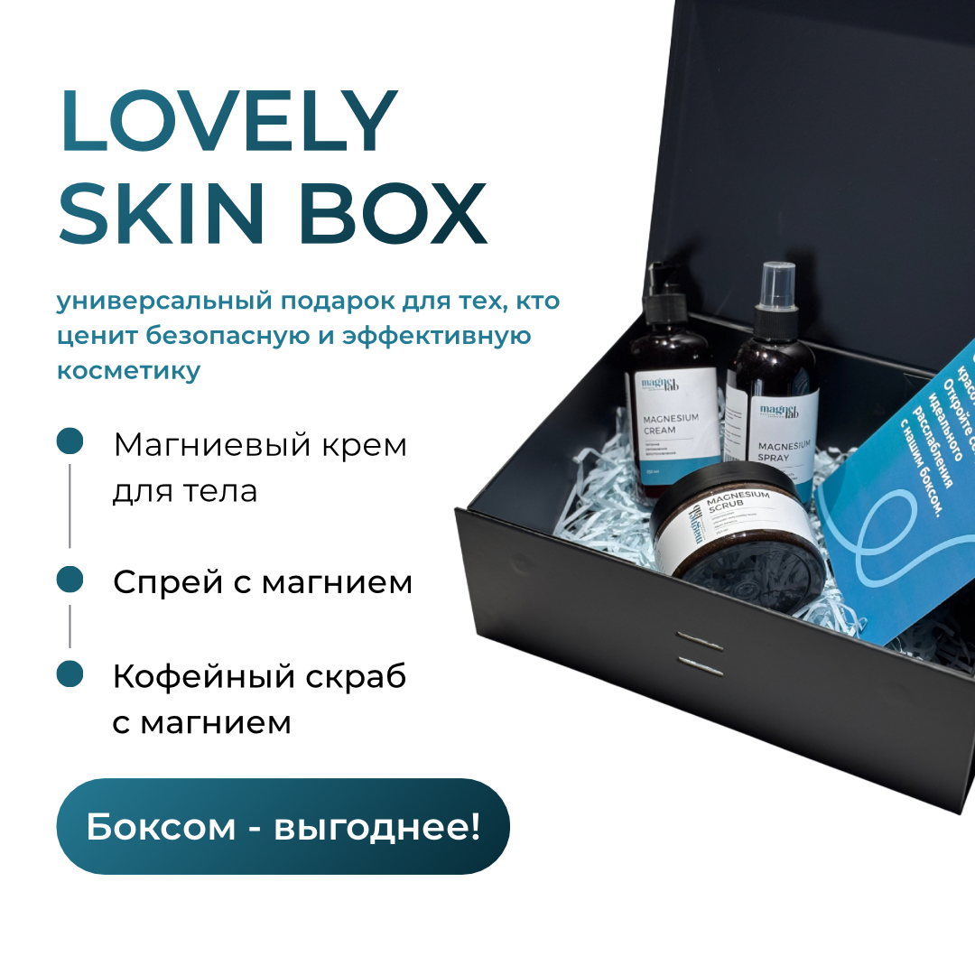 В составе Lovely Skin box: Magnesium cream Описание: Легкая текстура крема быстро впитывается, не оставляя жирной пленки, а натуральные компоненты проникают в глубокие слои кожи, обеспечивая интенсивное увлажнение и питание. Магний помогает снять стресс и расслабить мышцы, а масло ши восстанавливает барьерную функцию кожи. Крем особенно подходит для использования после душа или физических нагрузок.