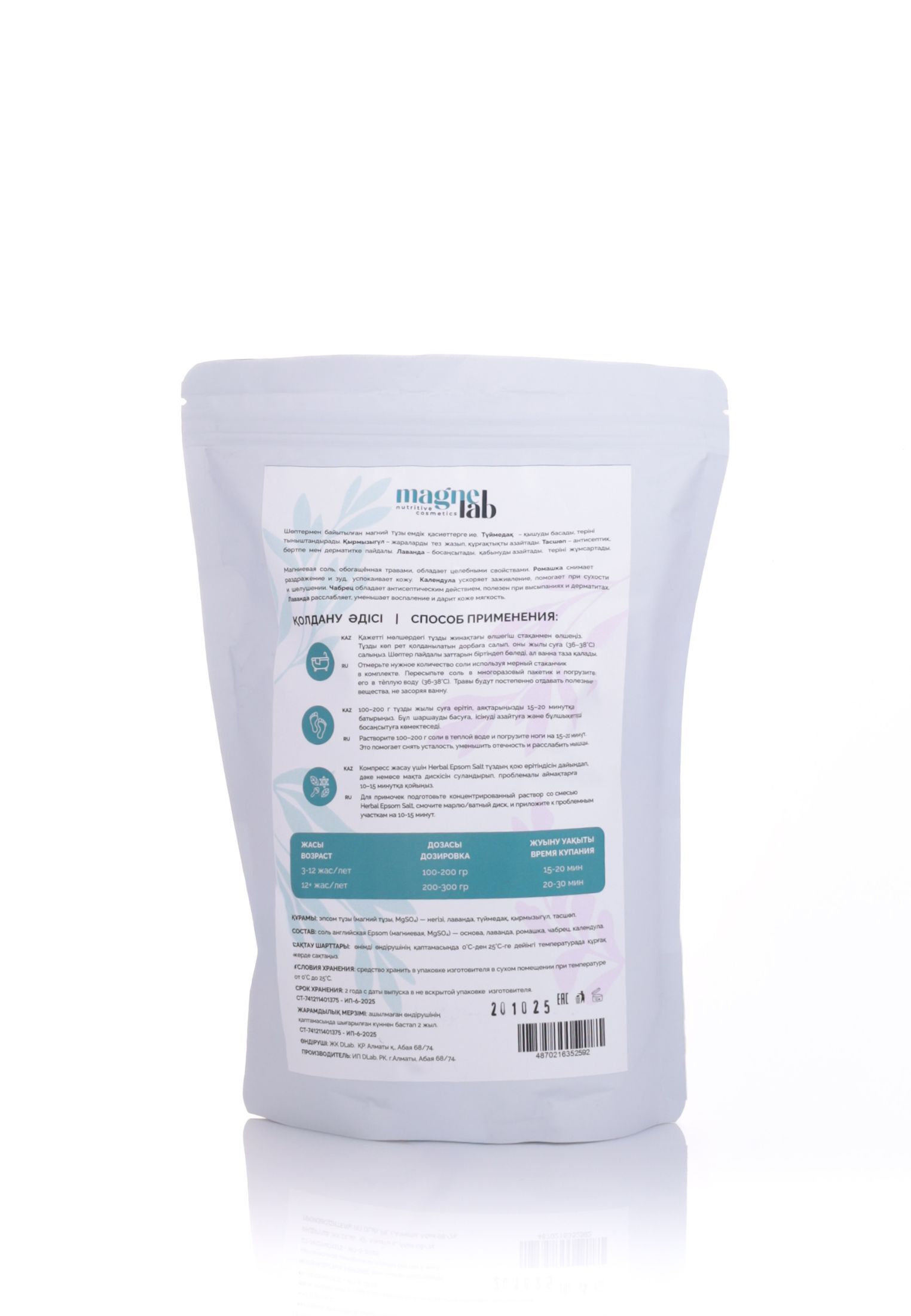 Состав: Magnesium Sulfate, Chamomile Flowers, Lavender Flowers, Calendula Flowers, Thyme Leaves. В составе — магниевая соль, обогащённая травами, известными своими целебными свойствами: Ромашка – снимает раздражение и зуд, успокаивает кожу. Календула – ускоряет заживление, помогает при сухости и шелушении. Чабрец – обладает антисептическим действием, полезен при высыпаниях и дерматитах. Лаванда – расслабляет, уменьшает воспаление и дарит коже мягкость. Magnesium Sulfate (Сульфат магния) - важный минерал, участвующий в более чем 300 биохимических процессах в организме, включая поддержку нервной системы и работу мышц. Помогает снимать мышечное напряжение, усталость и стресс, улучшает микроциркуляцию и общее самочувствие. При регулярном применении ванн с сульфатом магния кожа становится более мягкой и расслабленной, а мышцам легче восстанавливаться после нагрузок.