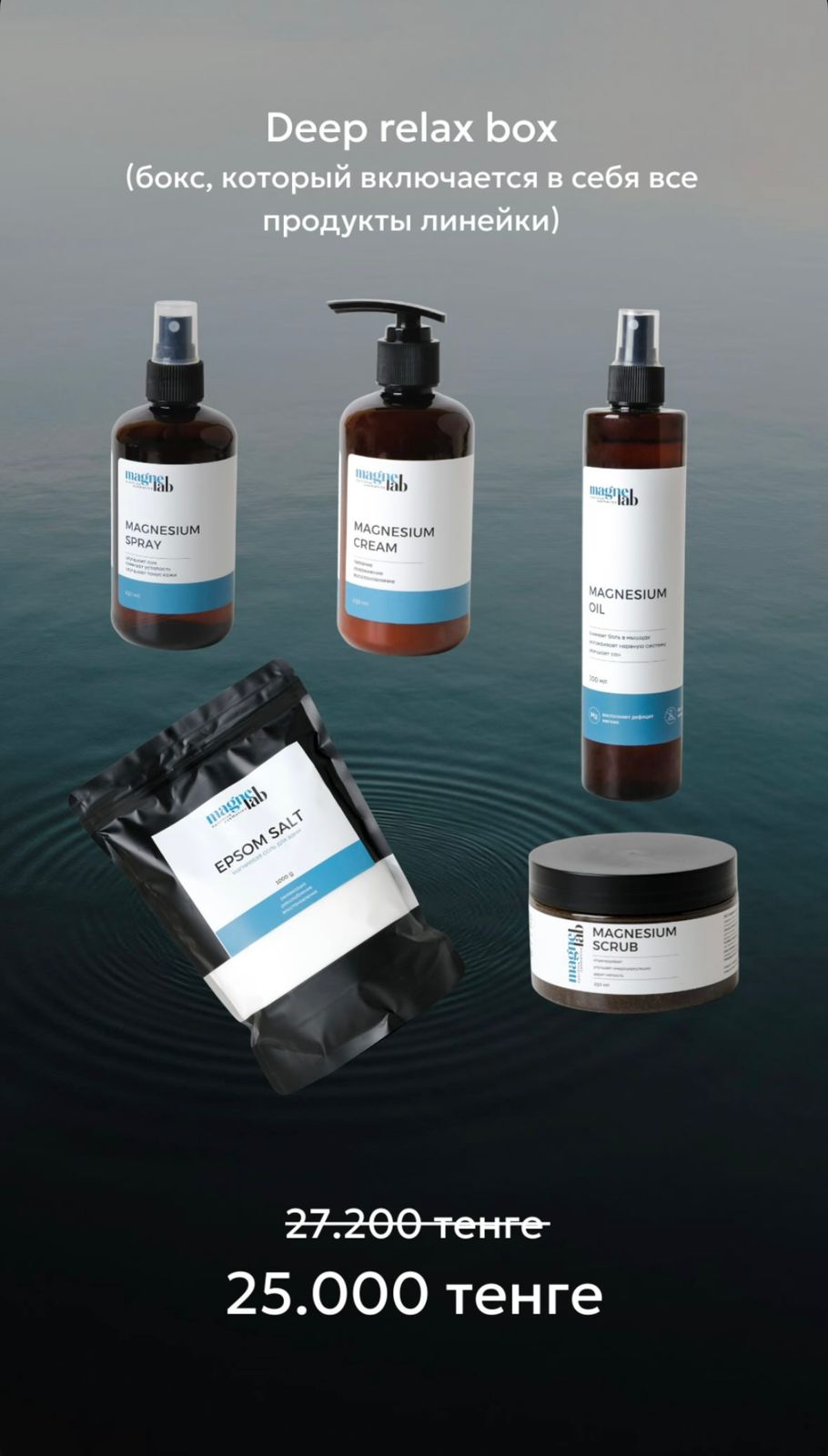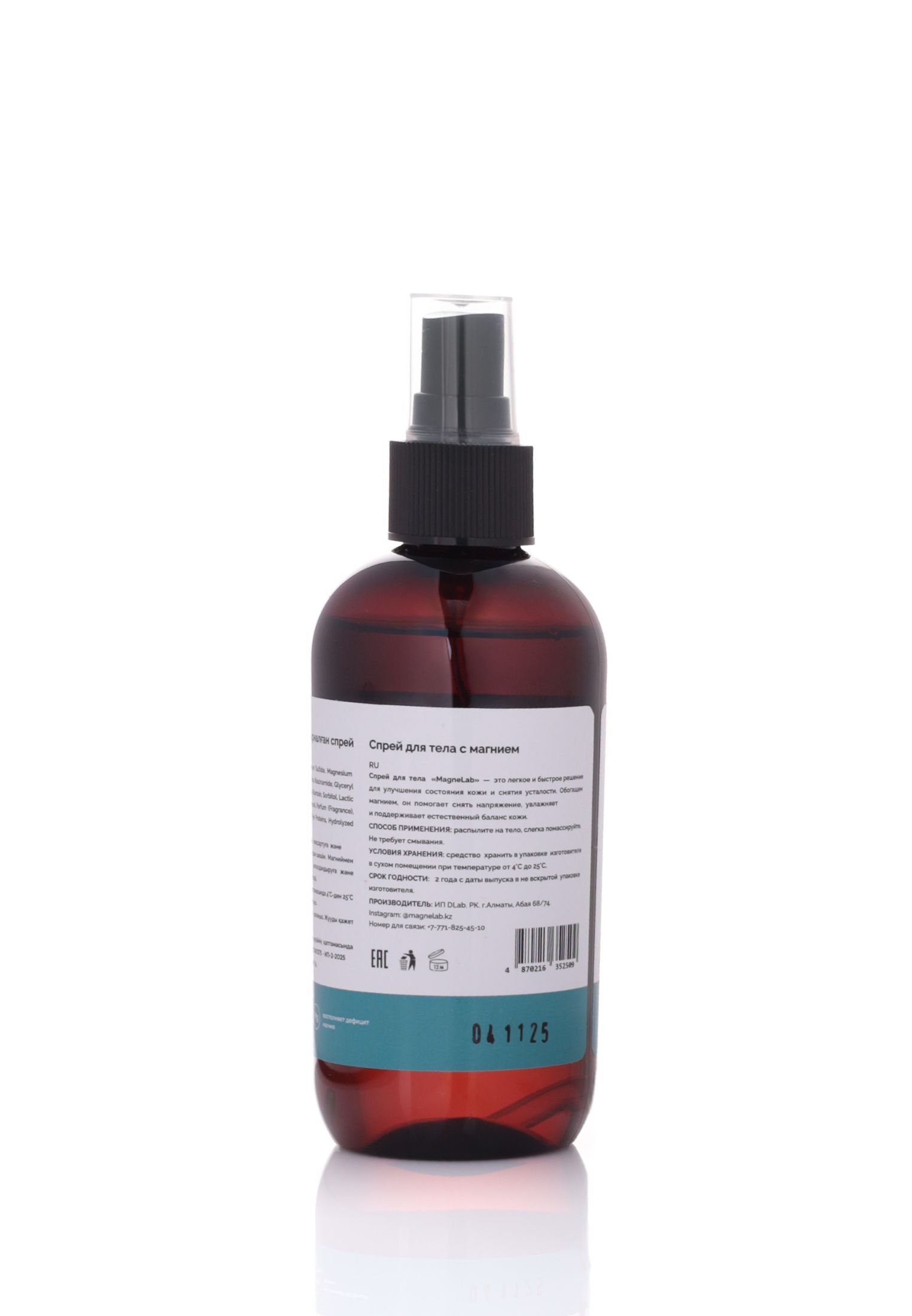 Magnesium spray Описание: Лёгкий, быстро впитывающийся спрей для ежедневного тонизирования и увлажнения кожи. Комбинация магниевых солей (Magnesium Sulfate и Magnesium Chloride) обеспечивает ощущение комфорта и свежести после тренировки, рабочего дня или длительных поездок, а комплекс увлажнителей и успокаивающих компонентов поддерживает гладкость и мягкость кожи без липкости.
