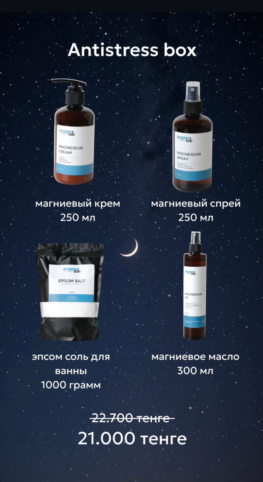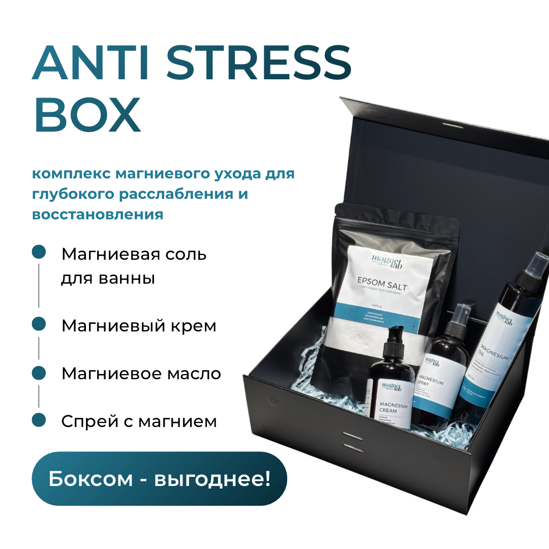 В составе Antistress box: Magnesium cream Описание: Легкая текстура крема быстро впитывается, не оставляя жирной пленки, а натуральные компоненты проникают в глубокие слои кожи, обеспечивая интенсивное увлажнение и питание. Магний помогает снять стресс и расслабить мышцы, а масло ши восстанавливает барьерную функцию кожи. Крем особенно подходит для использования после душа или физических нагрузок.