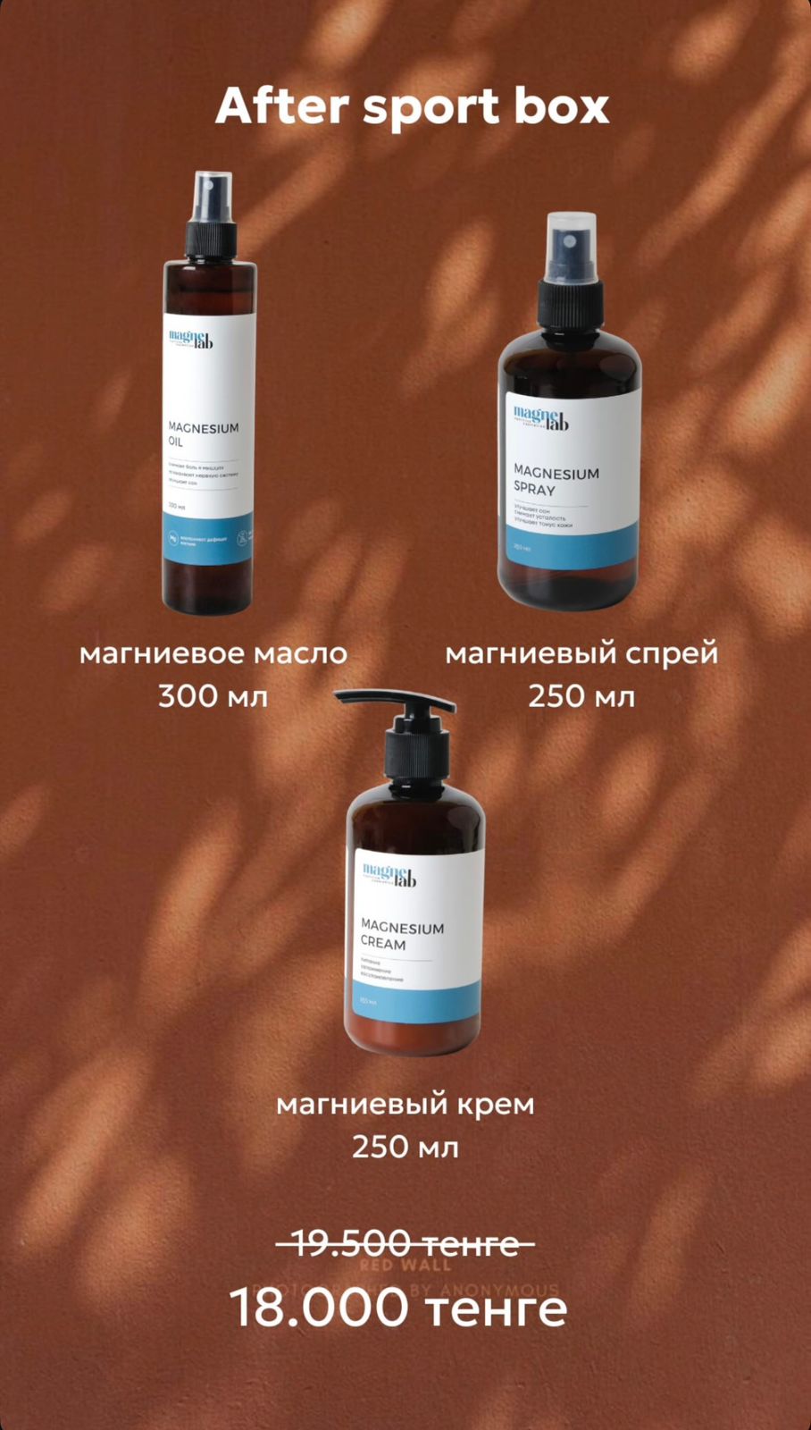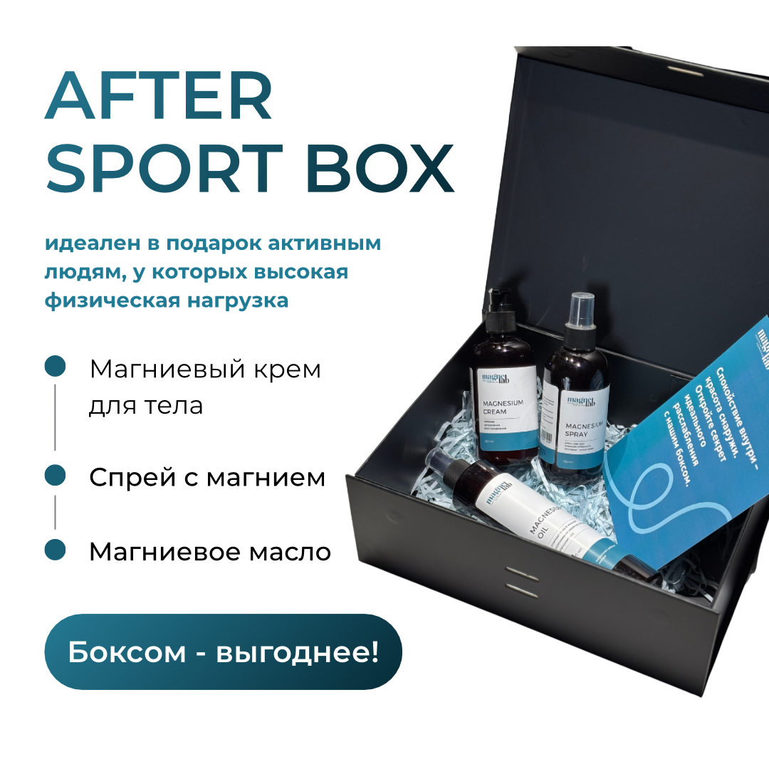 В составе After Sport бокса: Magnesium oil Описание: Магниевое масло создано для глубокого расслабления. Оно проникает в мышцы, снимая напряжение и улучшая их восстановление. Кроме того, масло улучшает кровообращение и помогает при судорогах. Благодаря удобному формату, его легко нанести на нужные участки тела. Поскольку в продукте нет масел, он не оставляет жирной плёнки.